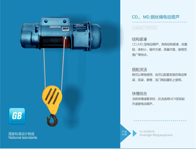 1、 CD1型、MD1型鋼絲繩電動(dòng)葫蘆是一種輕小型起重設(shè)備,它可以安裝在葫蘆單梁、橋式起重機(jī)、門式起重機(jī)、懸臂起重機(jī)上。稍加改動(dòng),還可作卷?yè)P(yáng)用。