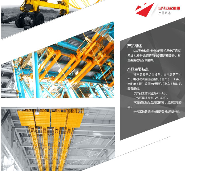 1、 XG型電動懸掛過軌起重機是電廠磨煤系統(tǒng)為發(fā)電機組配套的專用起重設(shè)備,其主要用途是檢修磨煤。