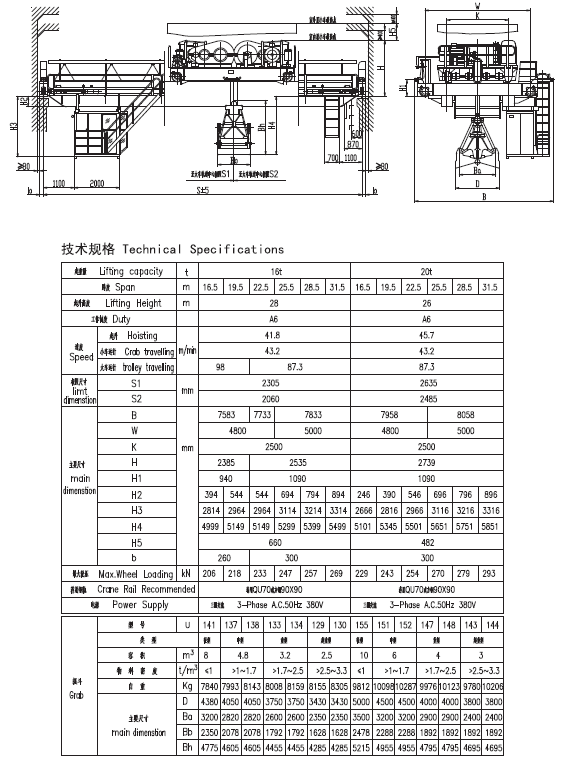 6、 取物裝置為雙卷筒的四繩抓斗,結(jié)構(gòu)簡單,工作可靠。抓斗可在任意高度張開和閉合。